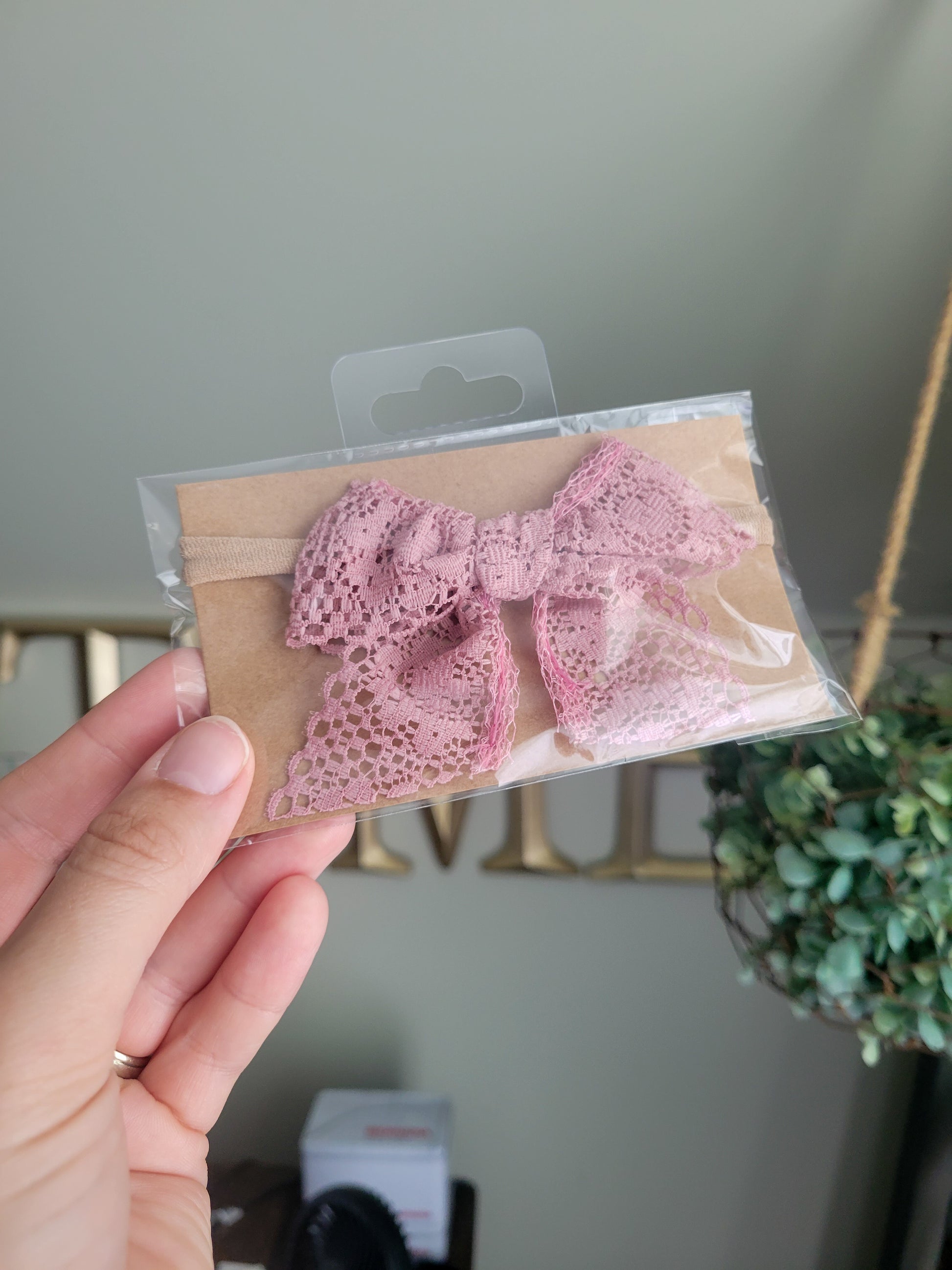 Bows made out of wide mauve vintage lace from my grandmother-in-law's notions and fabric collection. How lucky we are to be able to wear a part of the past.