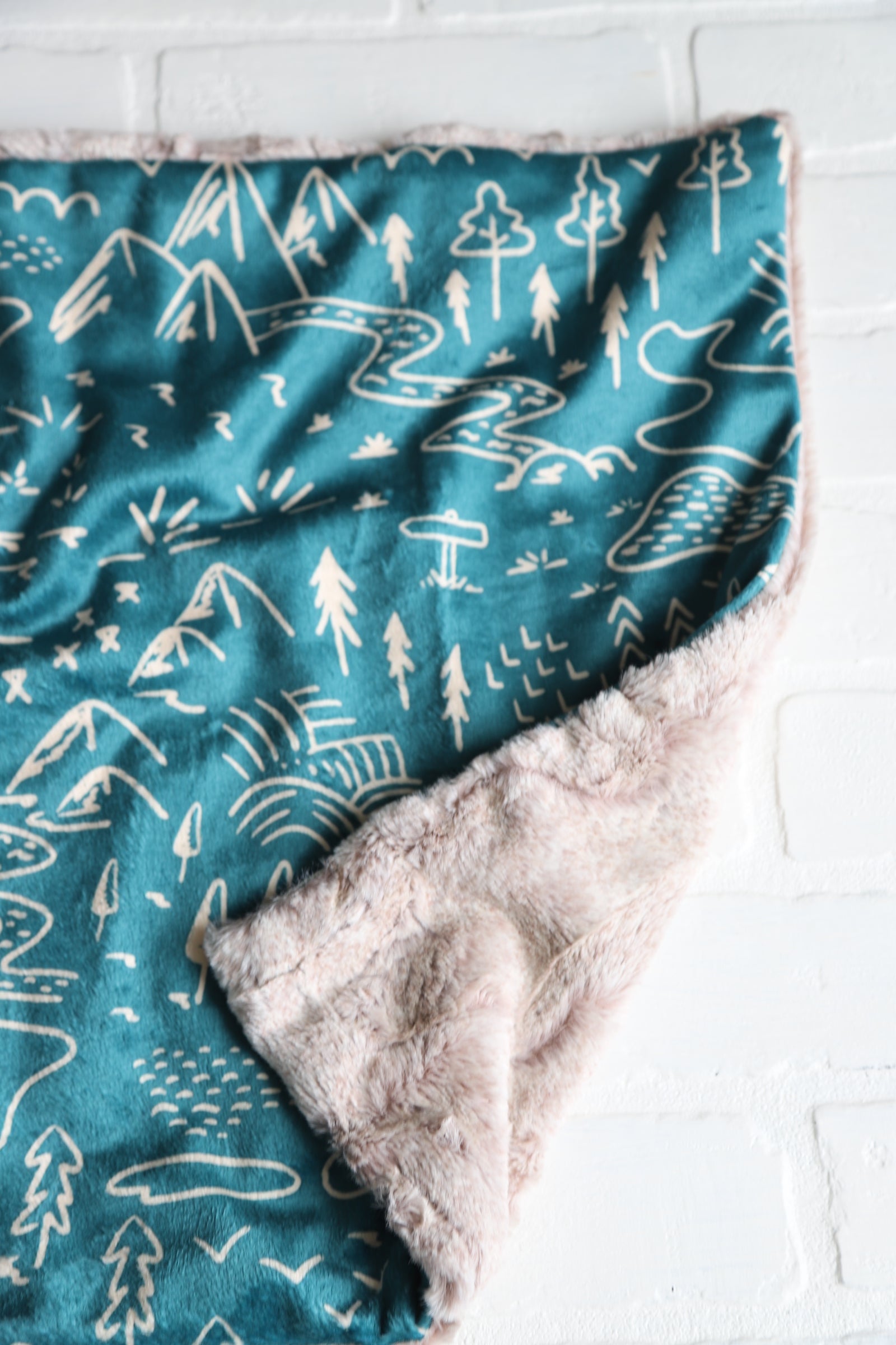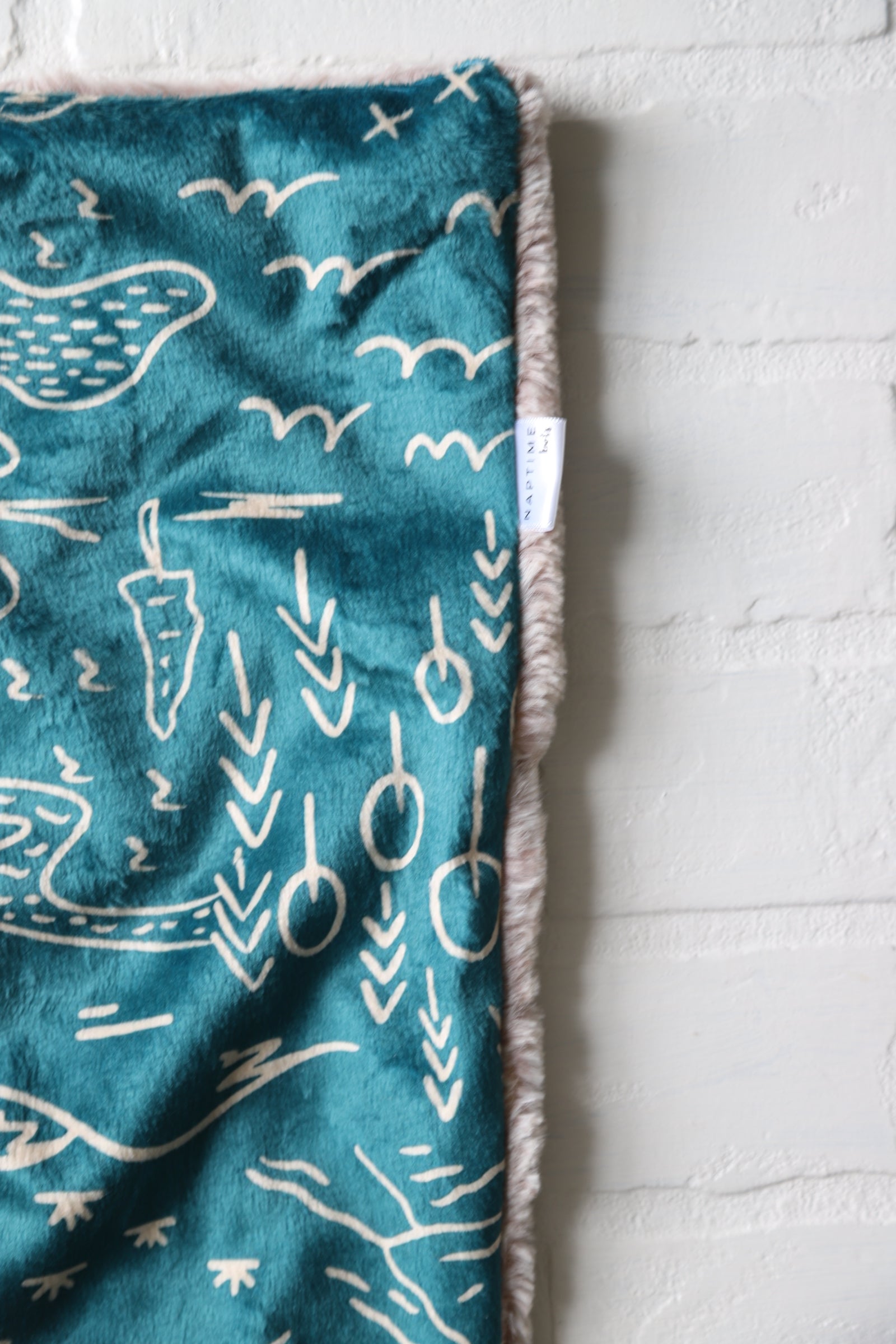 READY TO SHIP lovey featuring a deep teal background with tan map lines and mountains.
