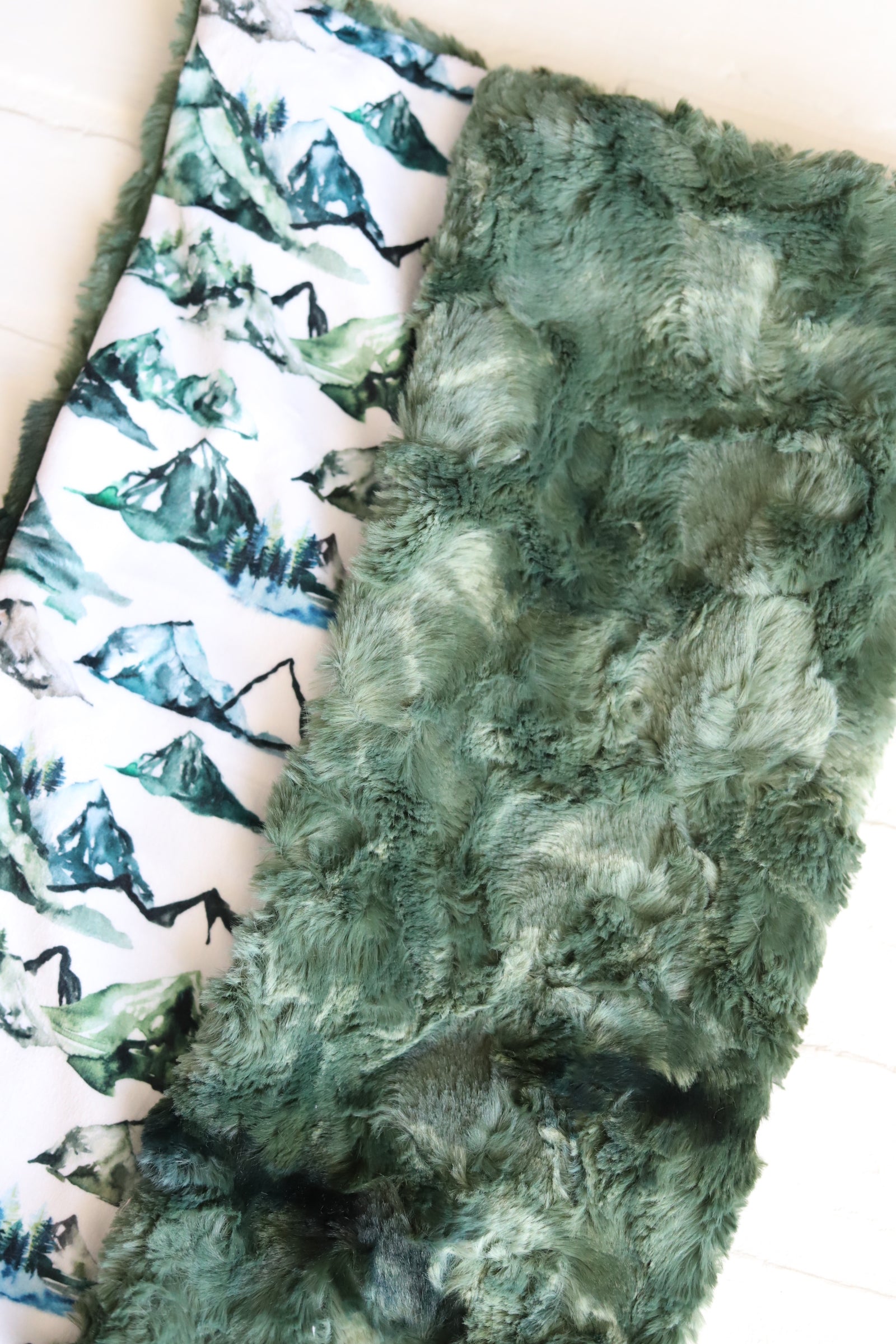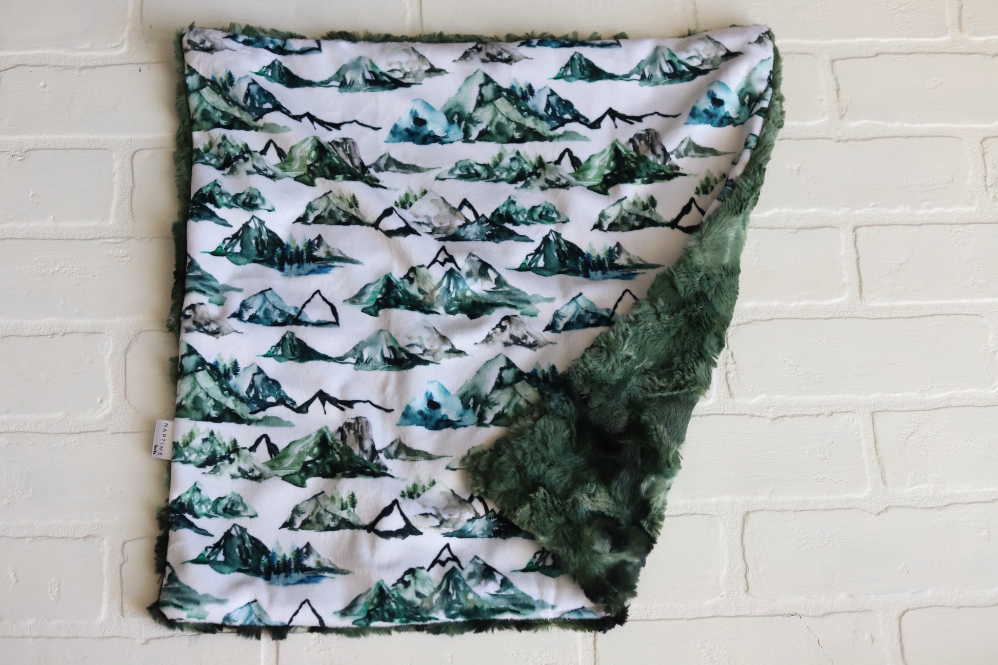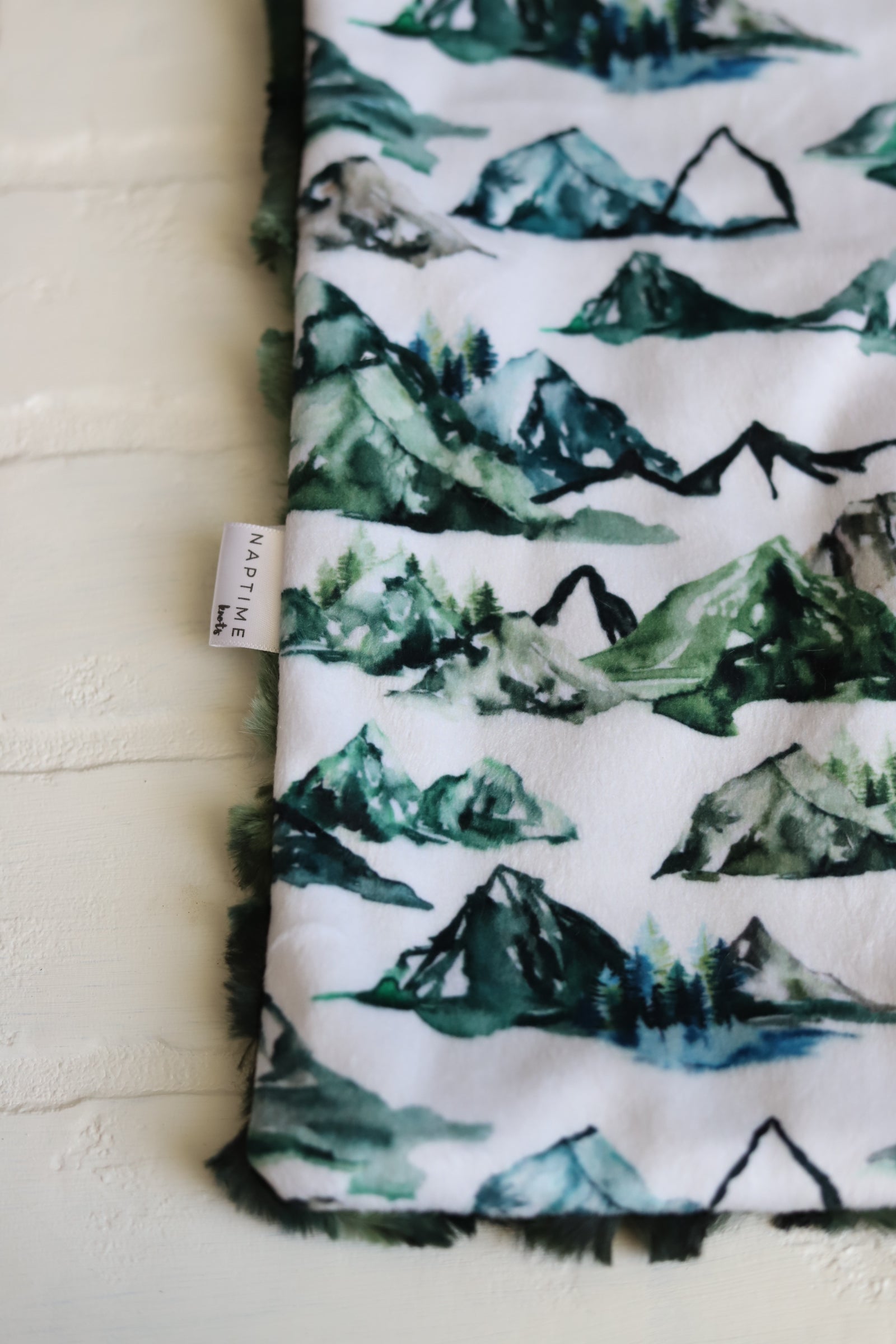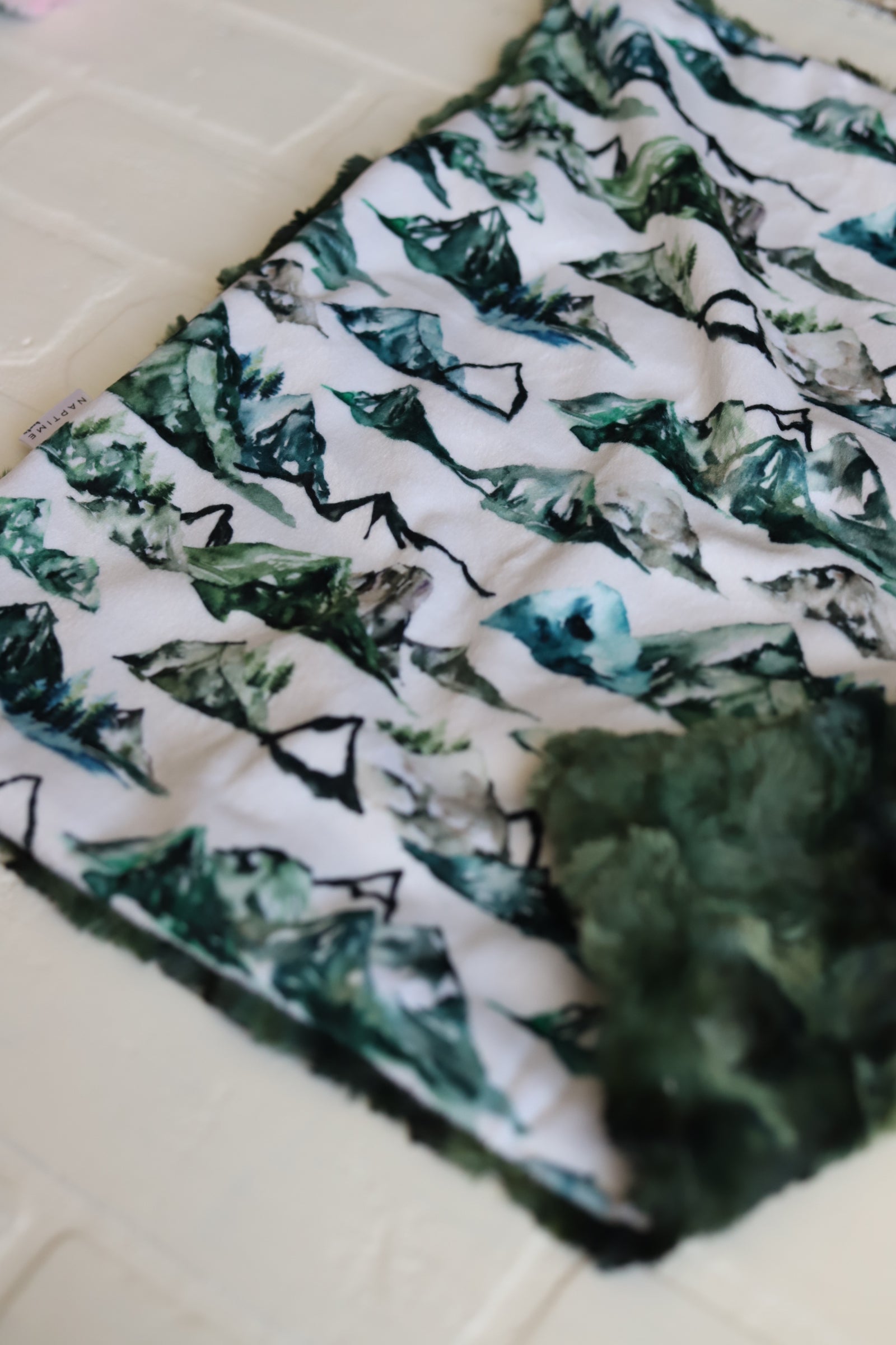 READY TO SHIP lovey featuring a Mountain pattern with greens and blues.