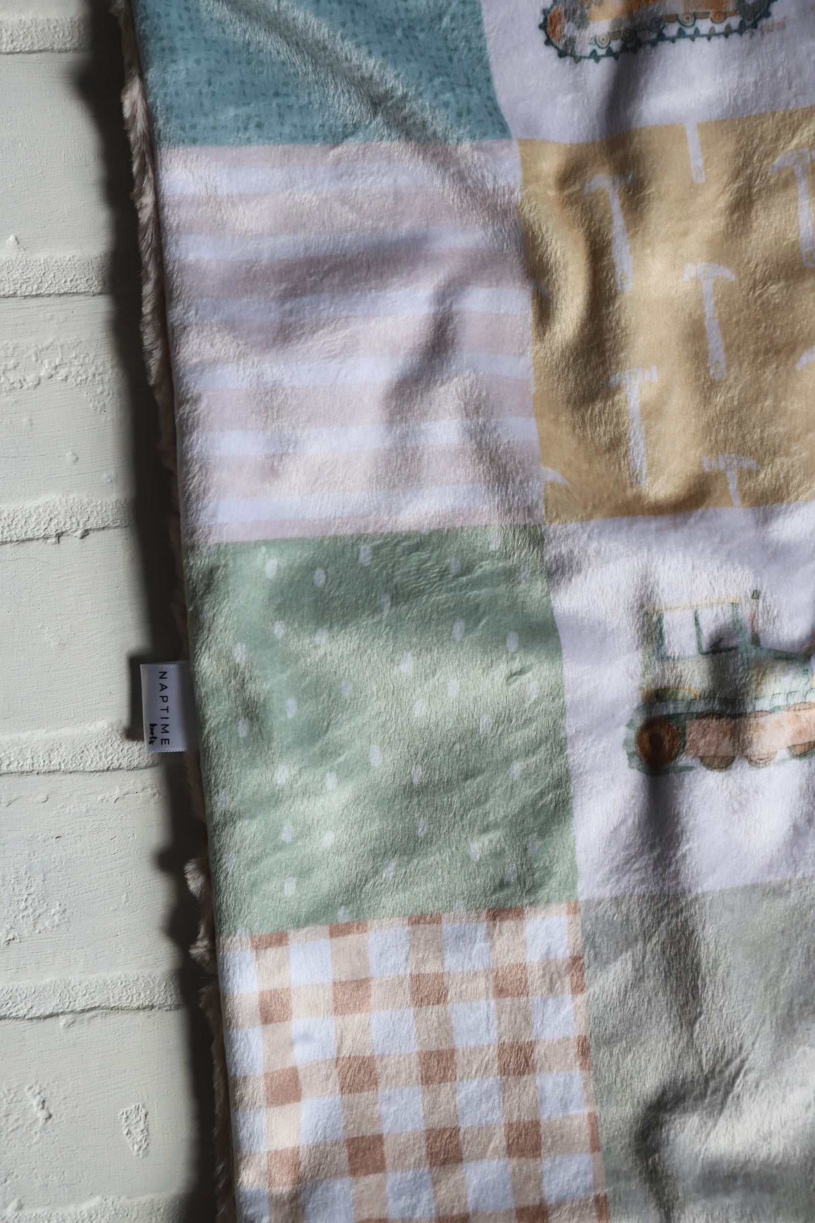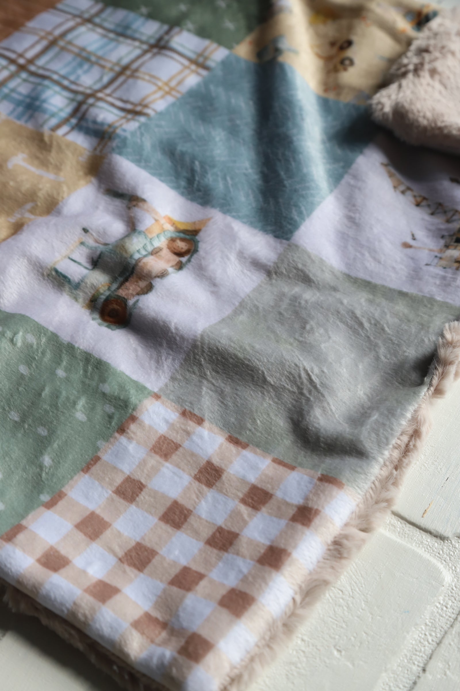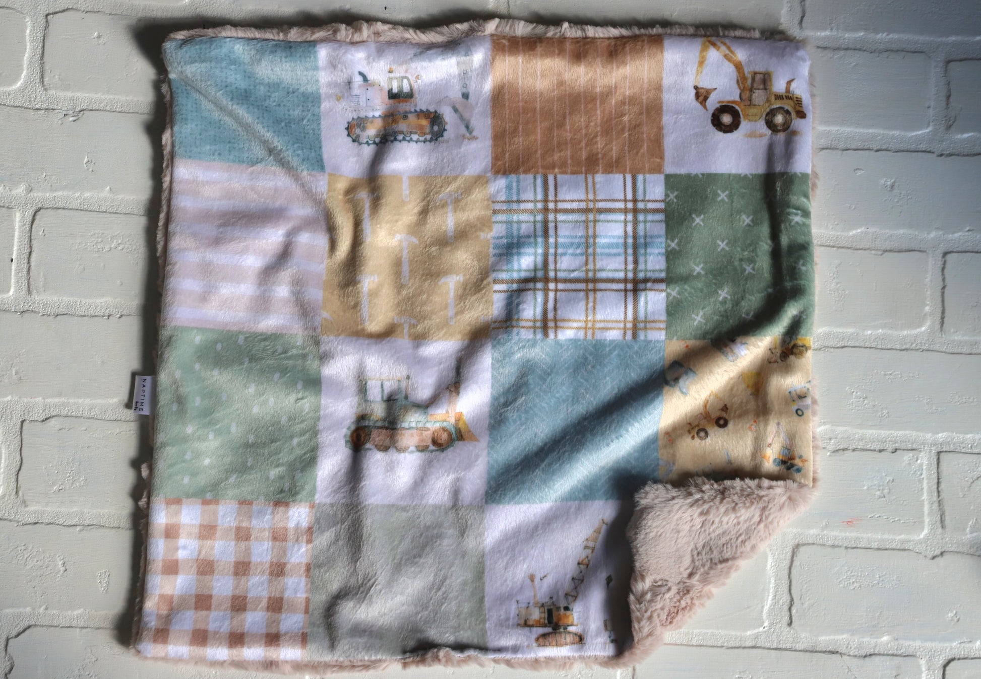 READY TO SHIP lovey featuring a cheater quilt style with greens and blues and construction vehicles