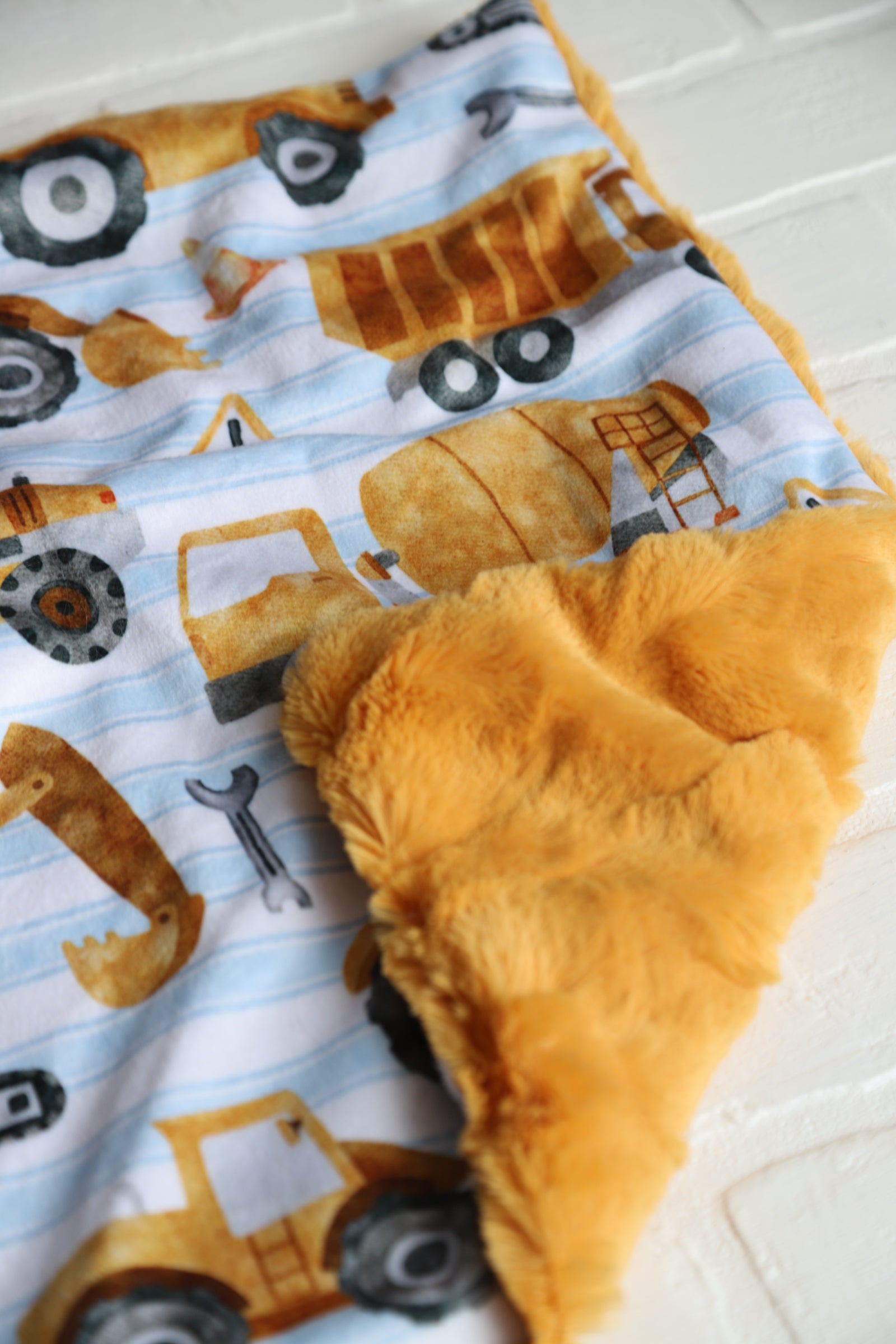 READY TO SHIP lovey featuring construction vehicles with blue stripea