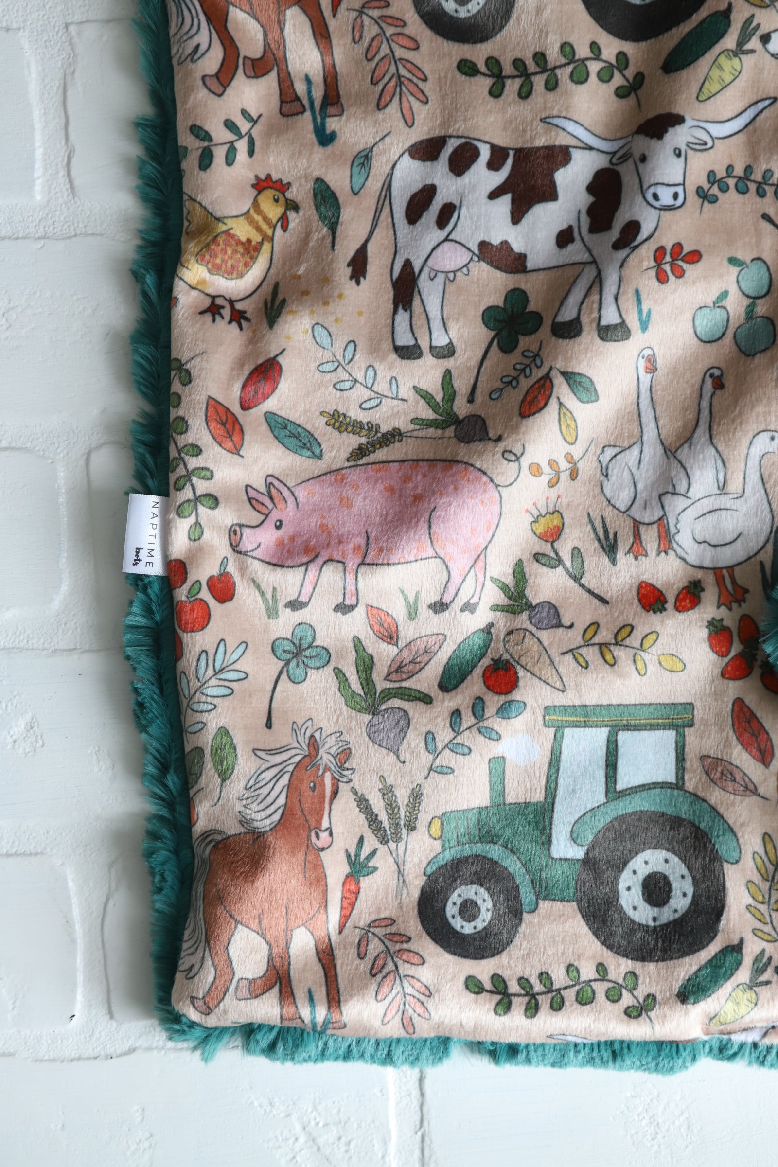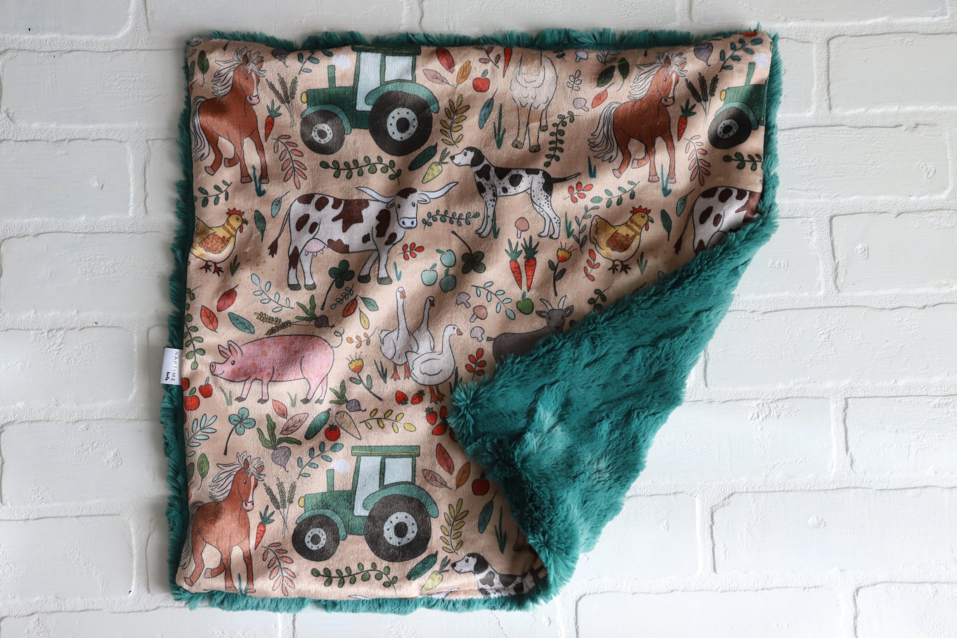 READY TO SHIP lovey featuring green tractor and farm animals on a linen background