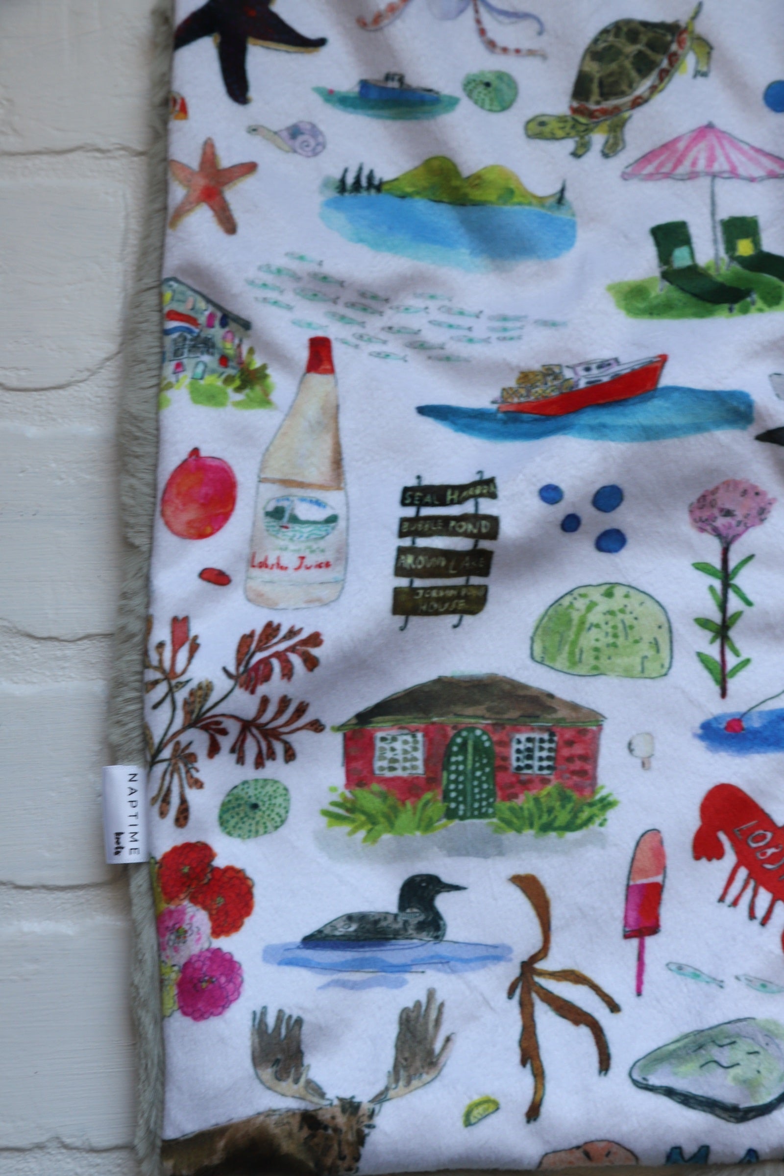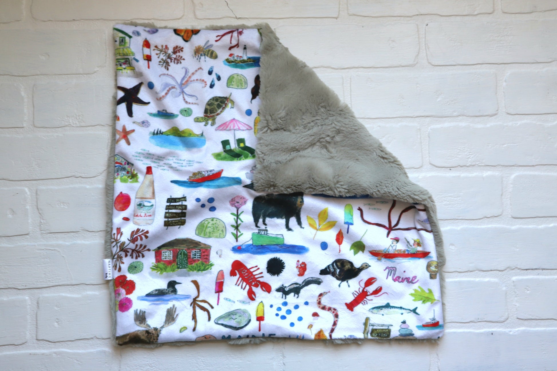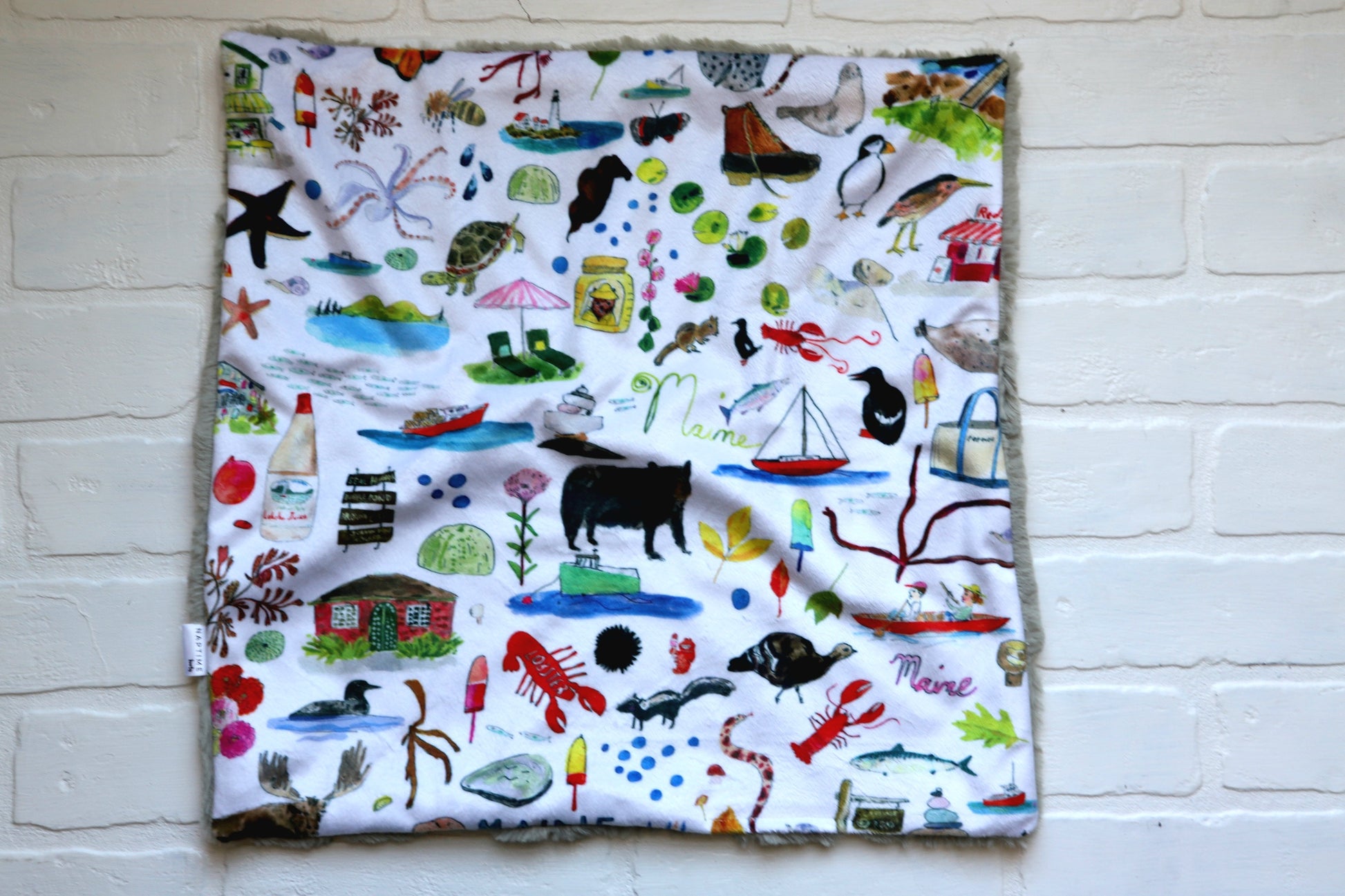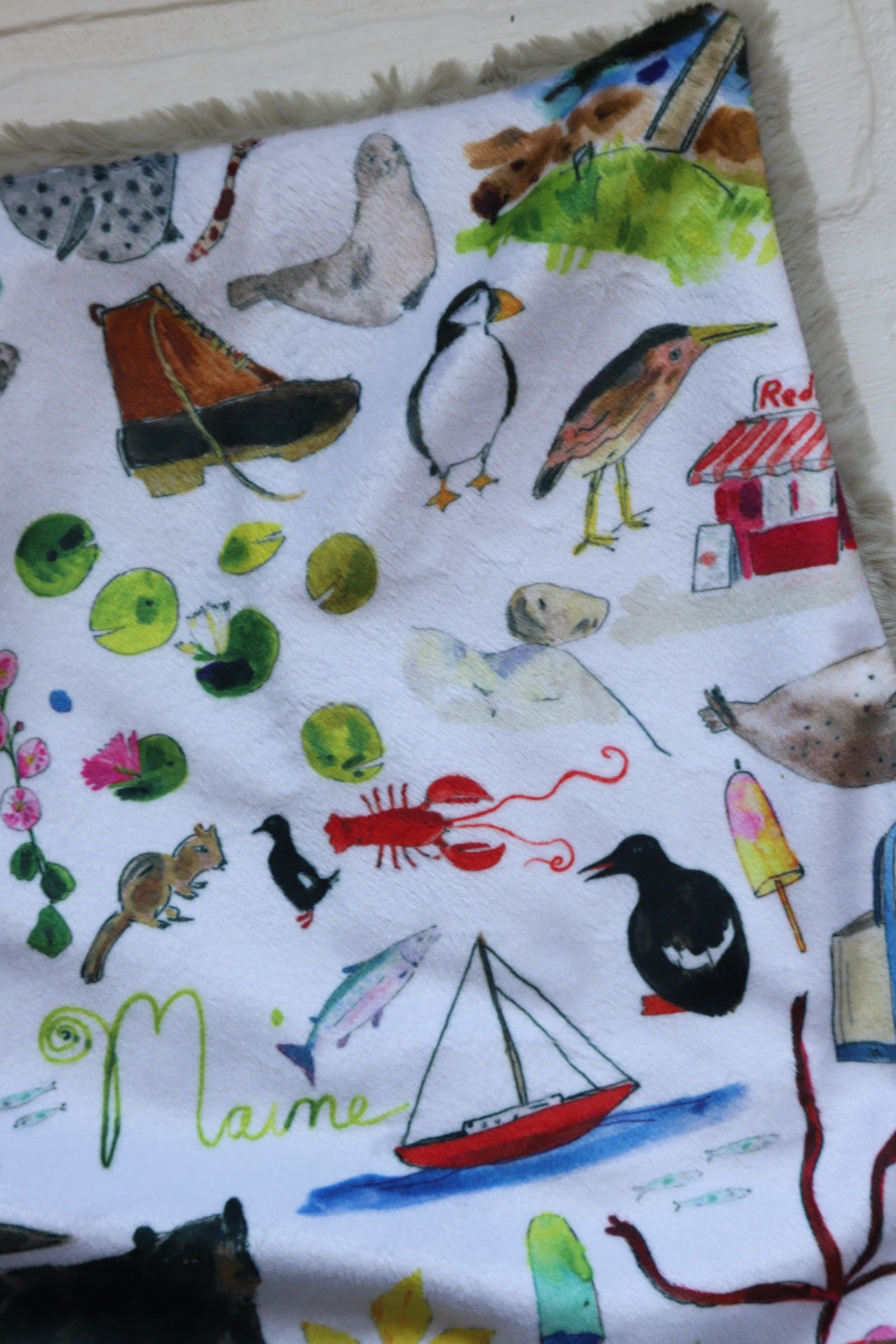 READY TO SHIP lovey featuring sketches of Maine- Marshall Point Lighthouse, LL Bean Boot and Tote bag, seals, Moose, Acadia National Park signage, Red's Eats in Wiscasset, even a Maine potato with the wording "Maine The Way Life Should Be"