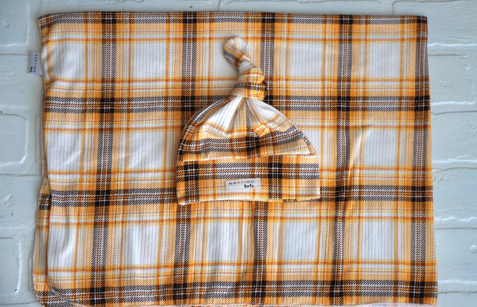 Orange/Yellow Ribbed Plaid Hat/Swaddle Set