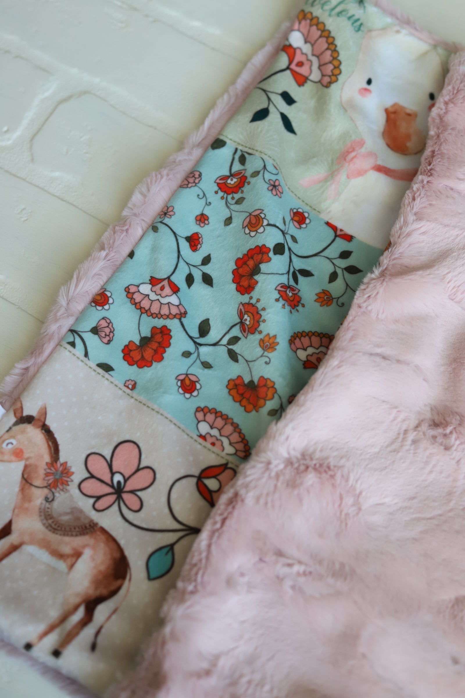 READY TO SHIP lovey featuring quilt like pattern with farm animals and flowers. Exact pattern varies per lovey.