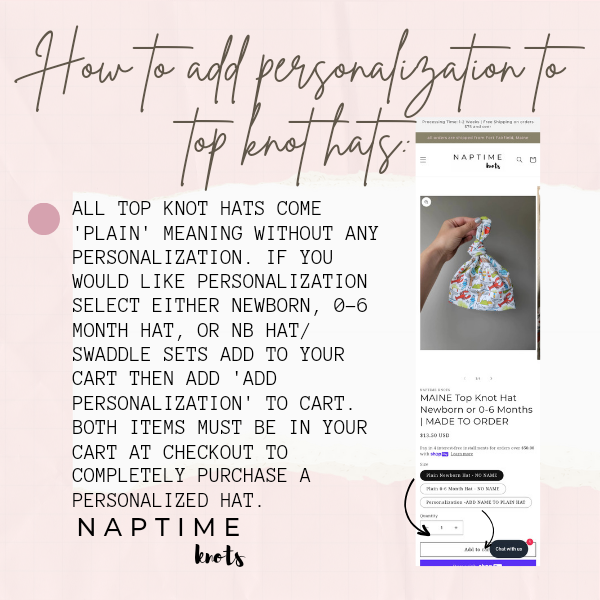All Top Knot Hats can be personalized. Just simply add Personalization ($8.50) to your cart IN ADDITION to your selected hat. Be sure to leave