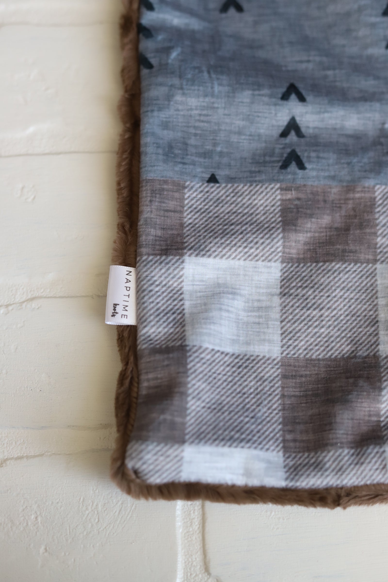 READY TO SHIP lovey featuring quilt like pattern with a buck and the words" Truck, Duck, and Eight Point Bucks are what little boys are made of".