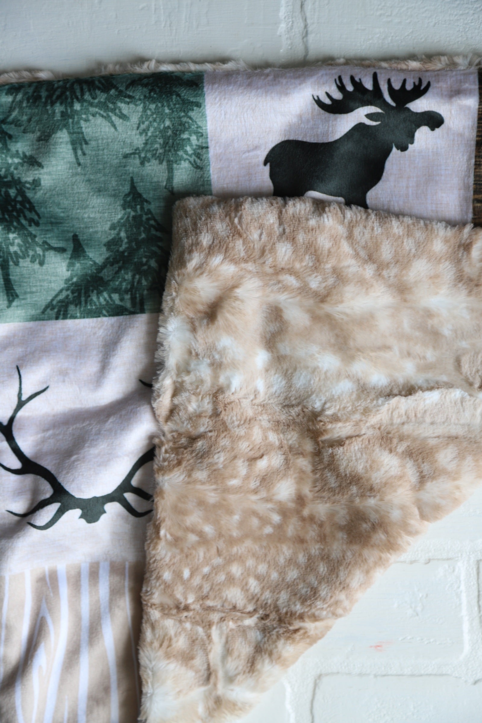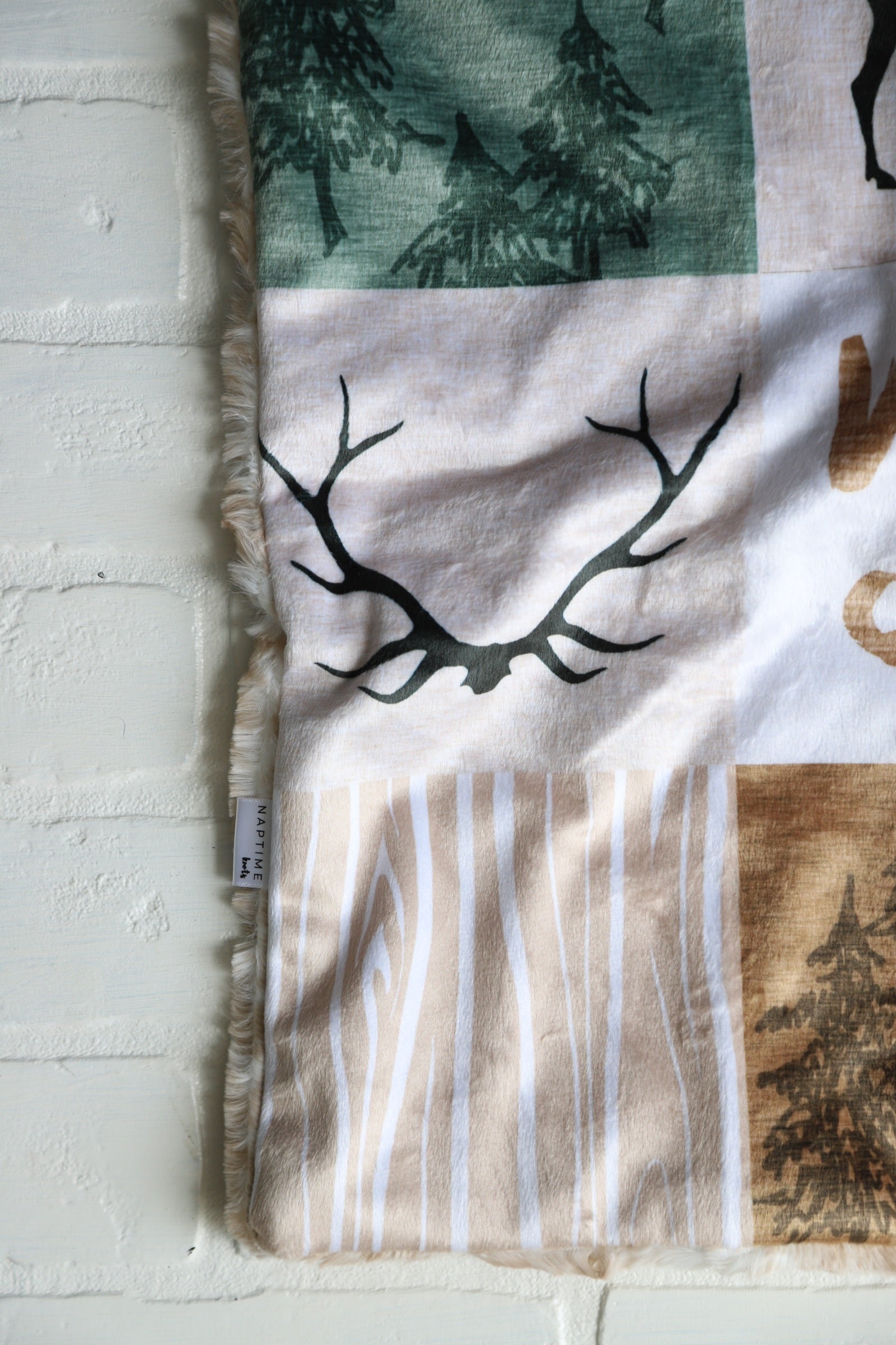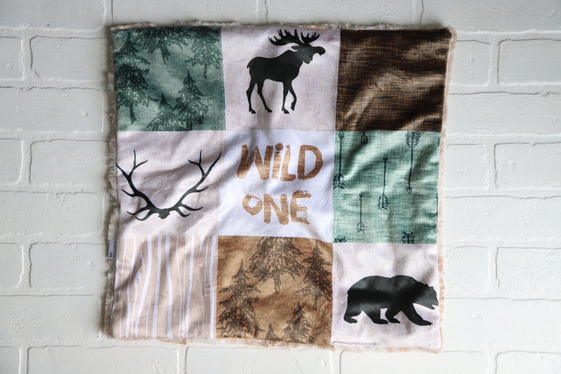 READY TO SHIP lovey featuring a faux quilt pattern with the words Wild One, deer antlers, moose and bear.
